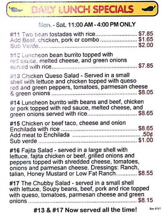 Large flour tortilla with refried beans, cheese, your choice of protein and topped with red sauce, melted cheese and green onions